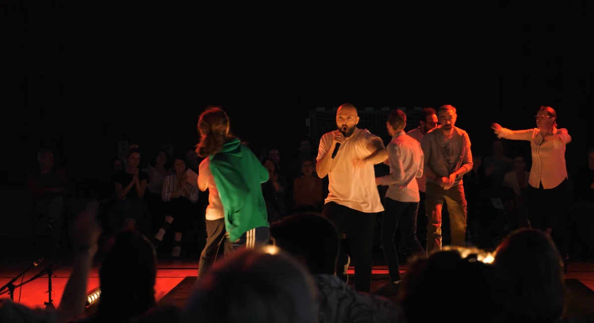• 4 comédien·nes survoltés, 1 Maître de cérémonie pour guider le show, et 1 musicien·ne en option pour le groove.